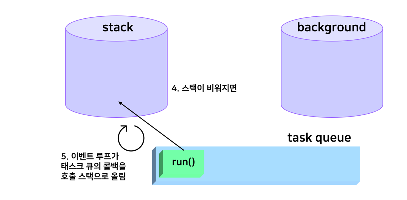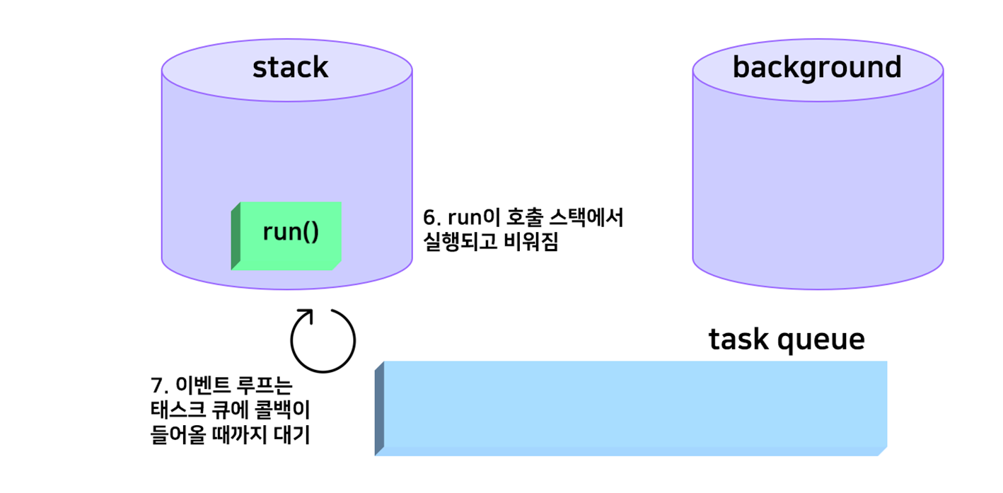 run() 함수는 백그라운드에서 3초를 센 뒤 태스크 큐로 들어간다. 그 후 호출 스택이 비워져 있는지 확인 후 비워져 있으면 run() 함수를 호출 스택에 넣고 실행한다.