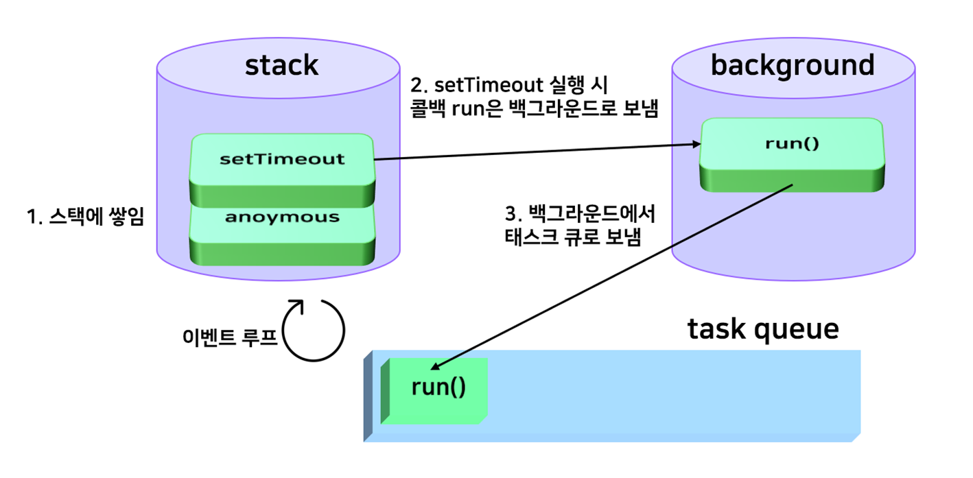 anonymous -> setTimeout 순서로 호출 스택에 들어간다. 그리고 setTimeout 함수가 먼저 실행이 되니까 run() 함수가 백그라운드로 들어간다. 그다음 anonymous가 호출 스택에 빠진다.