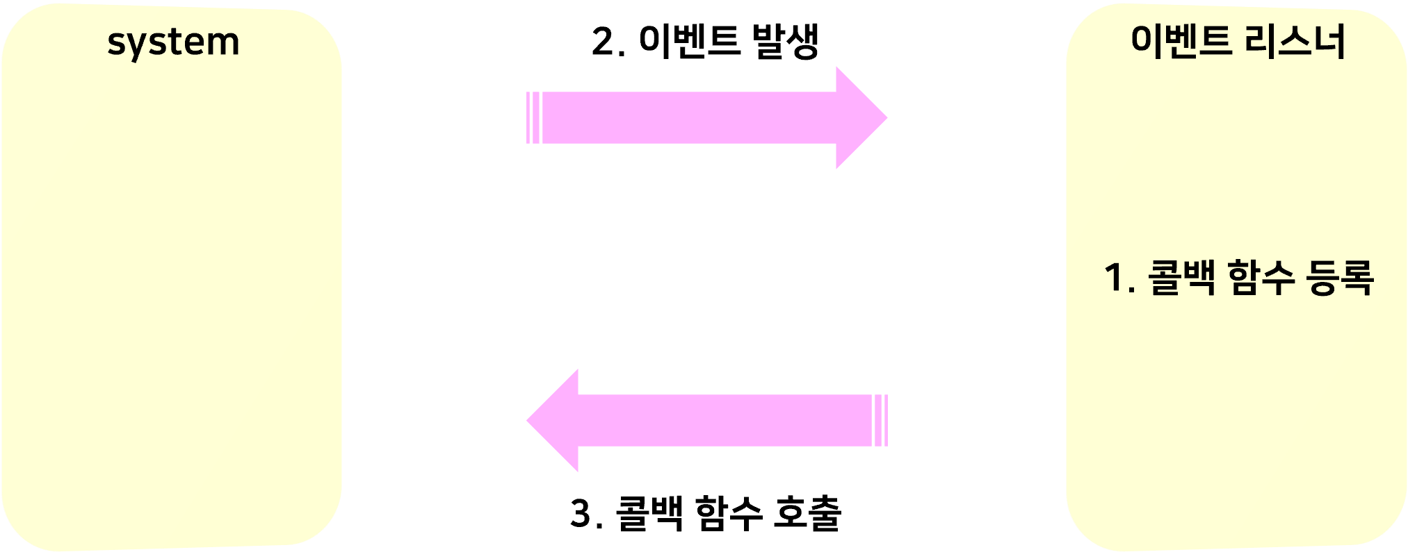 이벤트 기반 시스템에는 특정 이벤트가 발생할 때 무엇을 할지 미리 등록해두어야 하는데 이를 이벤트 리스너에 콜백함수를 등록한다고 표현한다.