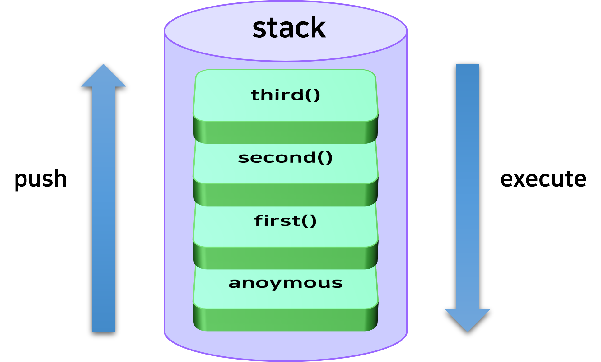 코드를 실행하면 위처럼 호출 스택이 push 되고 third() 함수부터 실행이 된다.